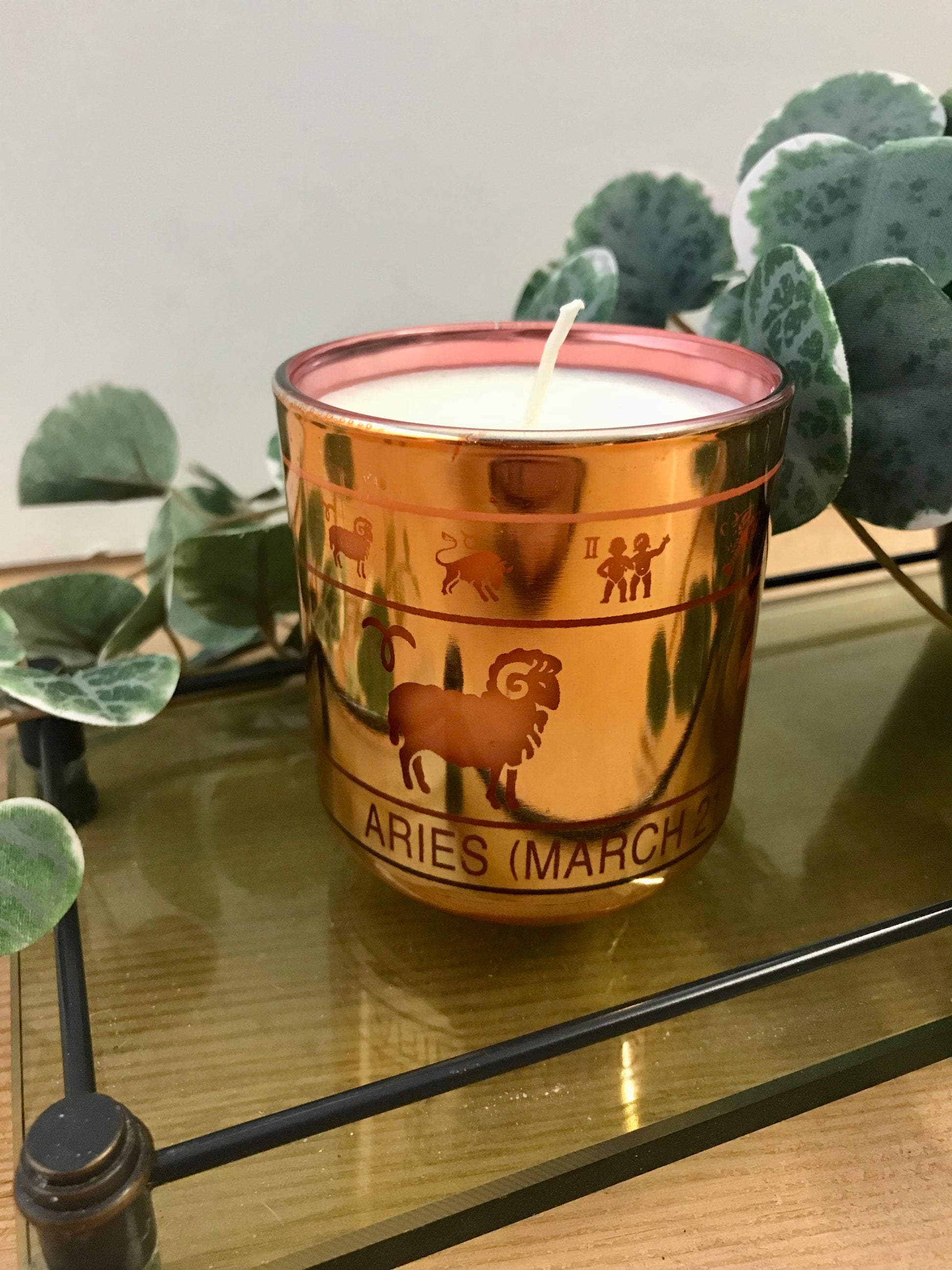 Vintage gold and red metallic glass Aries candle. also features all 12 signs that your favorite Aries probably finds inferior anyway.