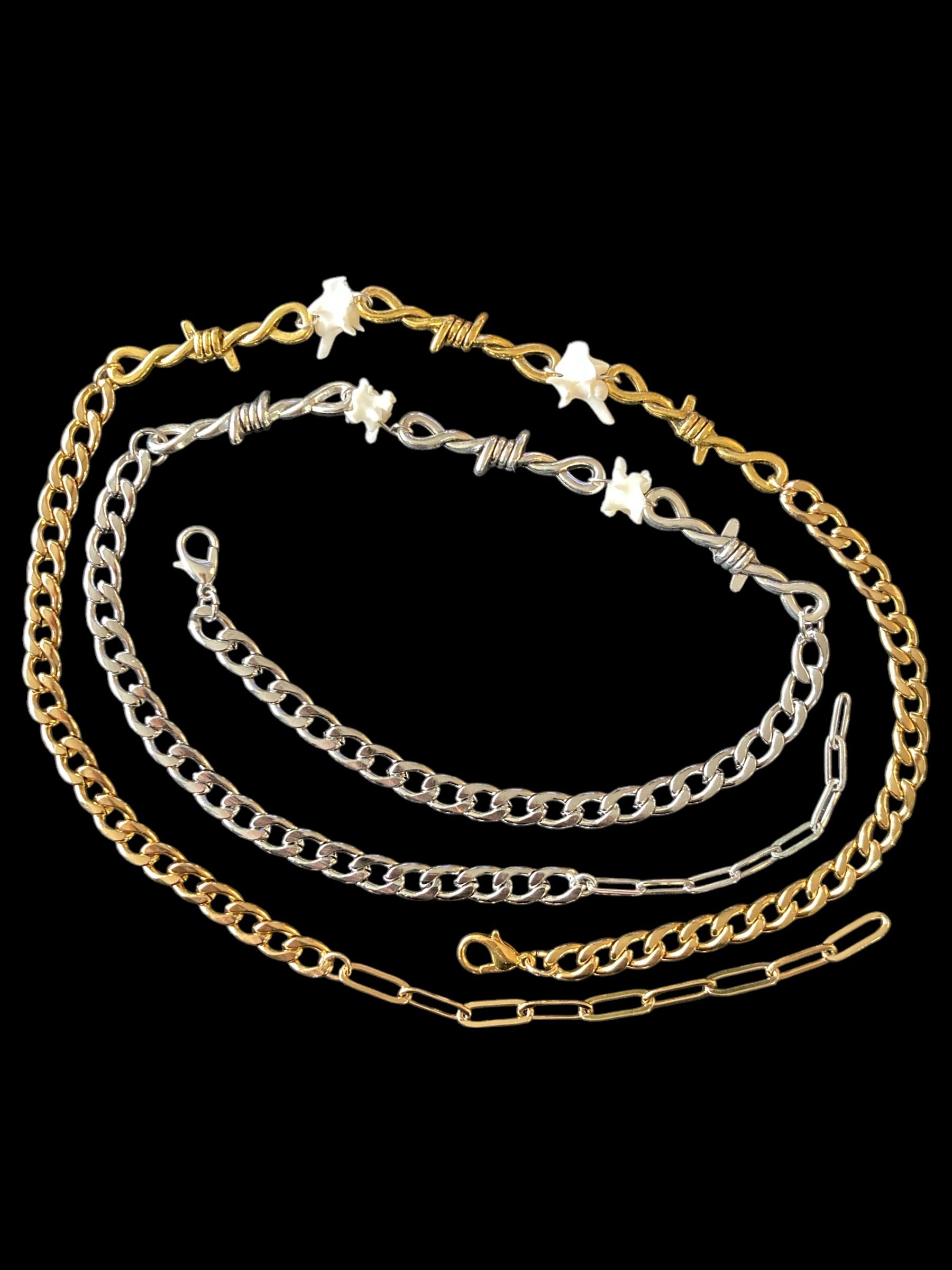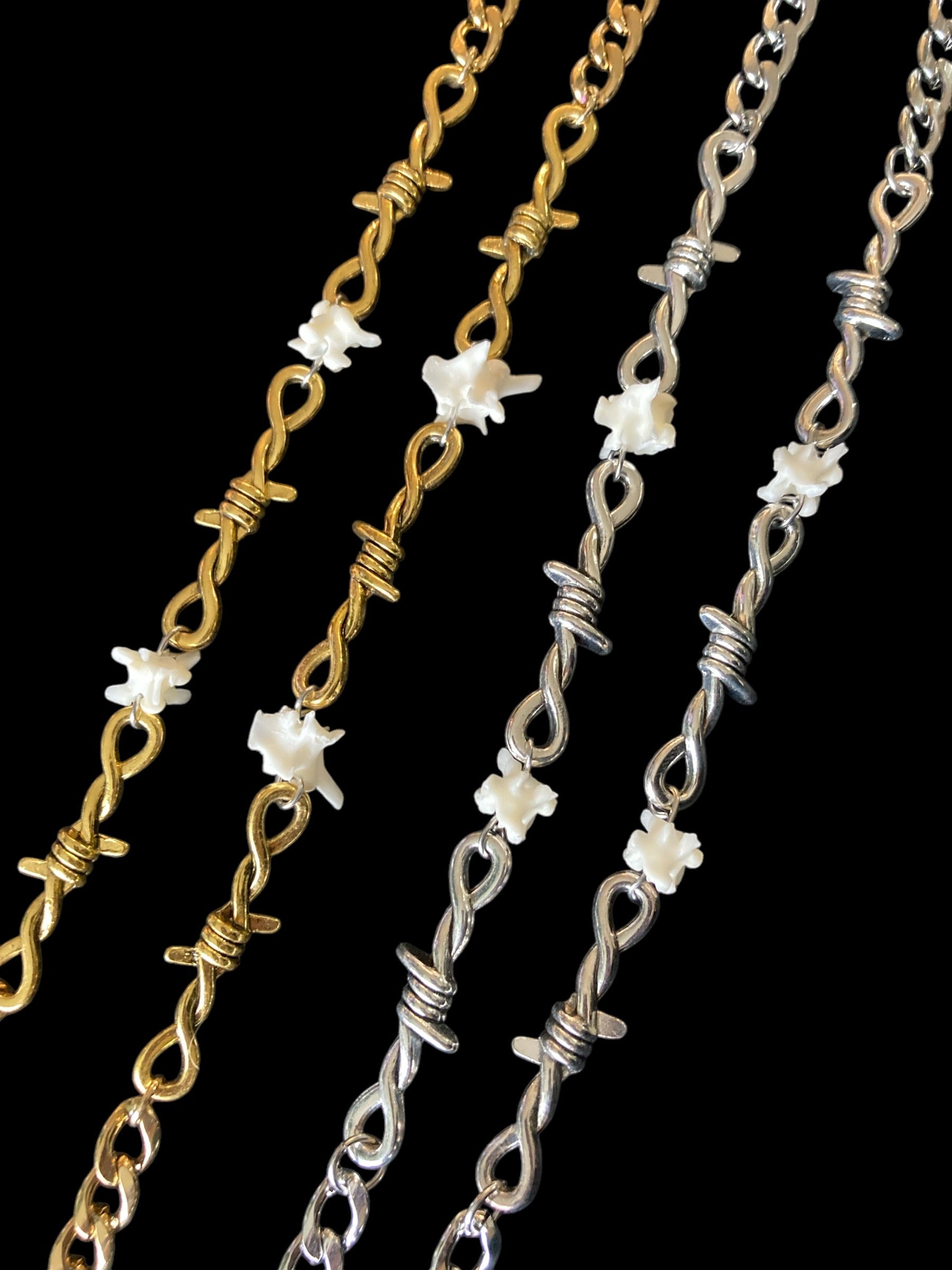 Barbed wire choker with 2 real rattlesnake vertebrae! Bone size and shape will vary per item