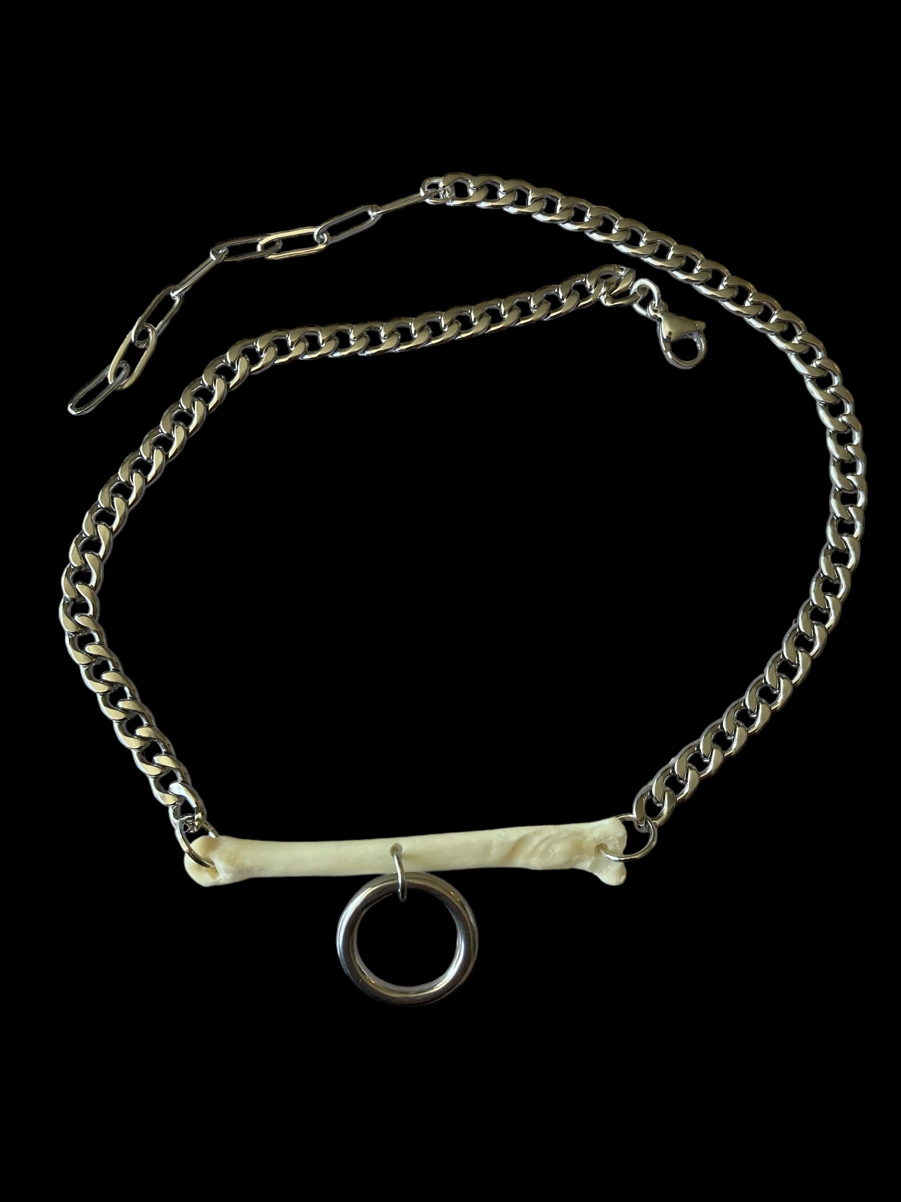 Ethically sourced Coyote foot bone choker featuring silver o-ring on stainless chain