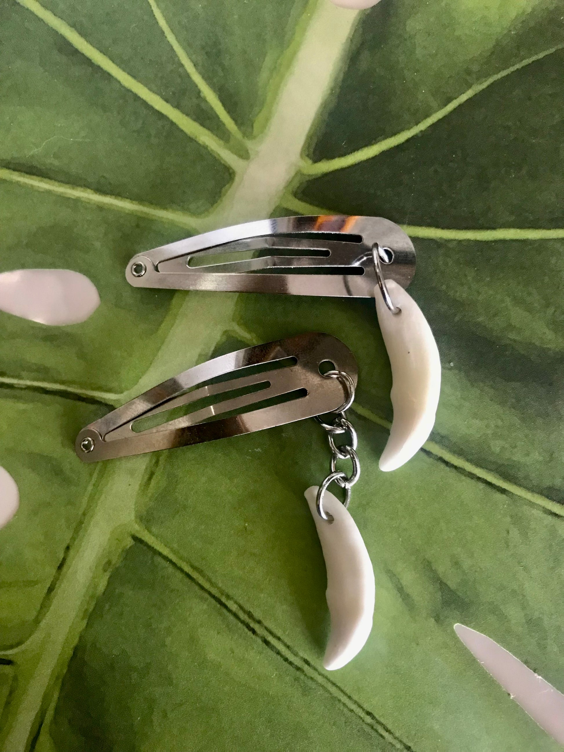 Asymmetrical hair clips with a pair of coyote teeth. Size of teeth may vary slightly