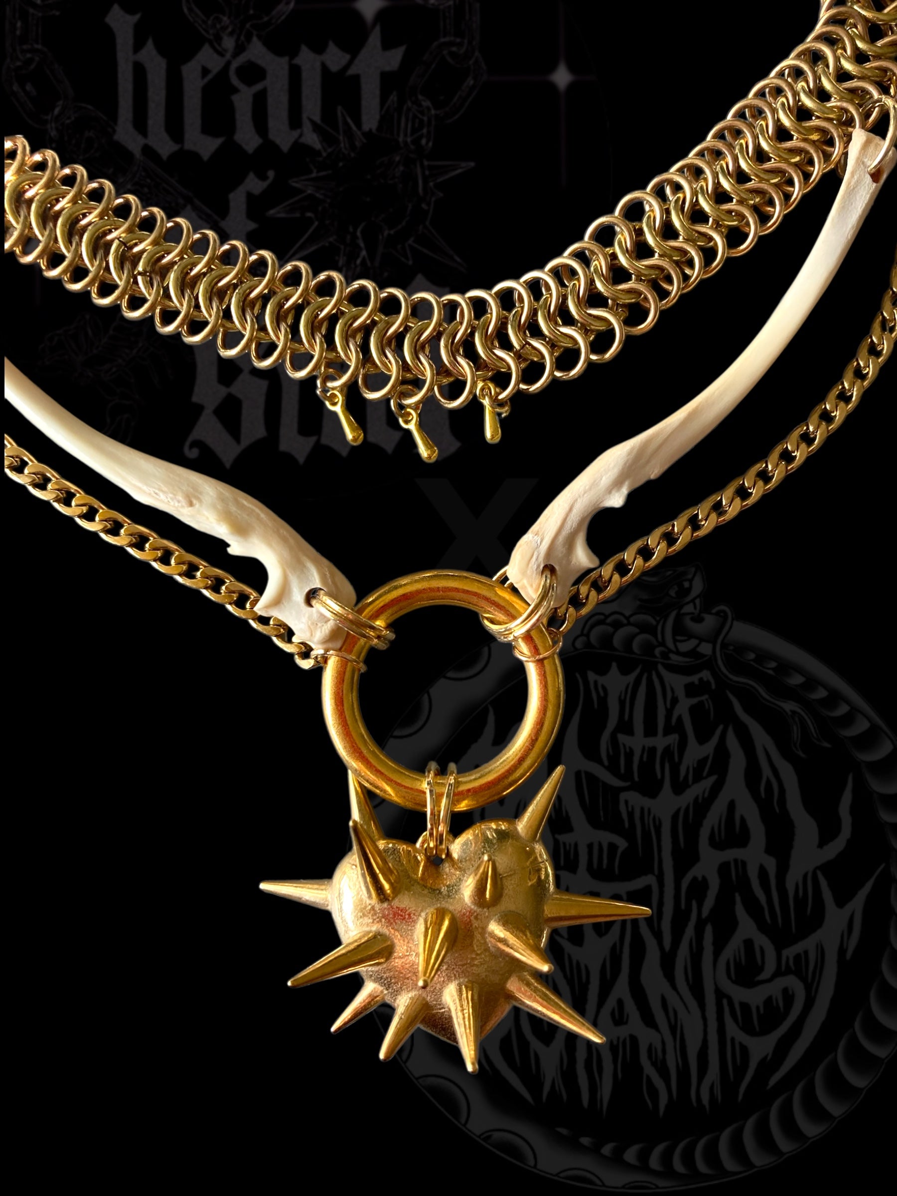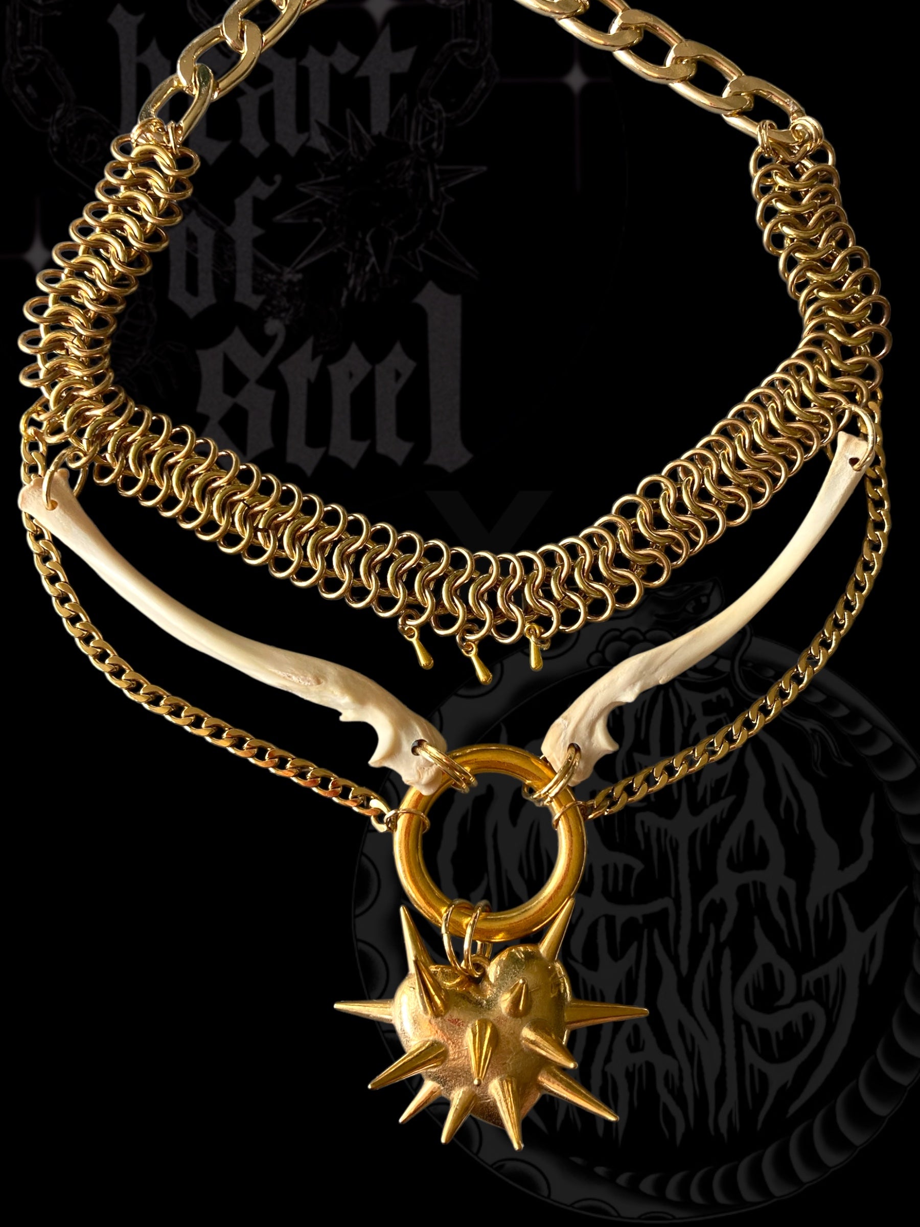 Vintage brass chainmaille with found rabbit ulna bones and gold plated stainless embellishments