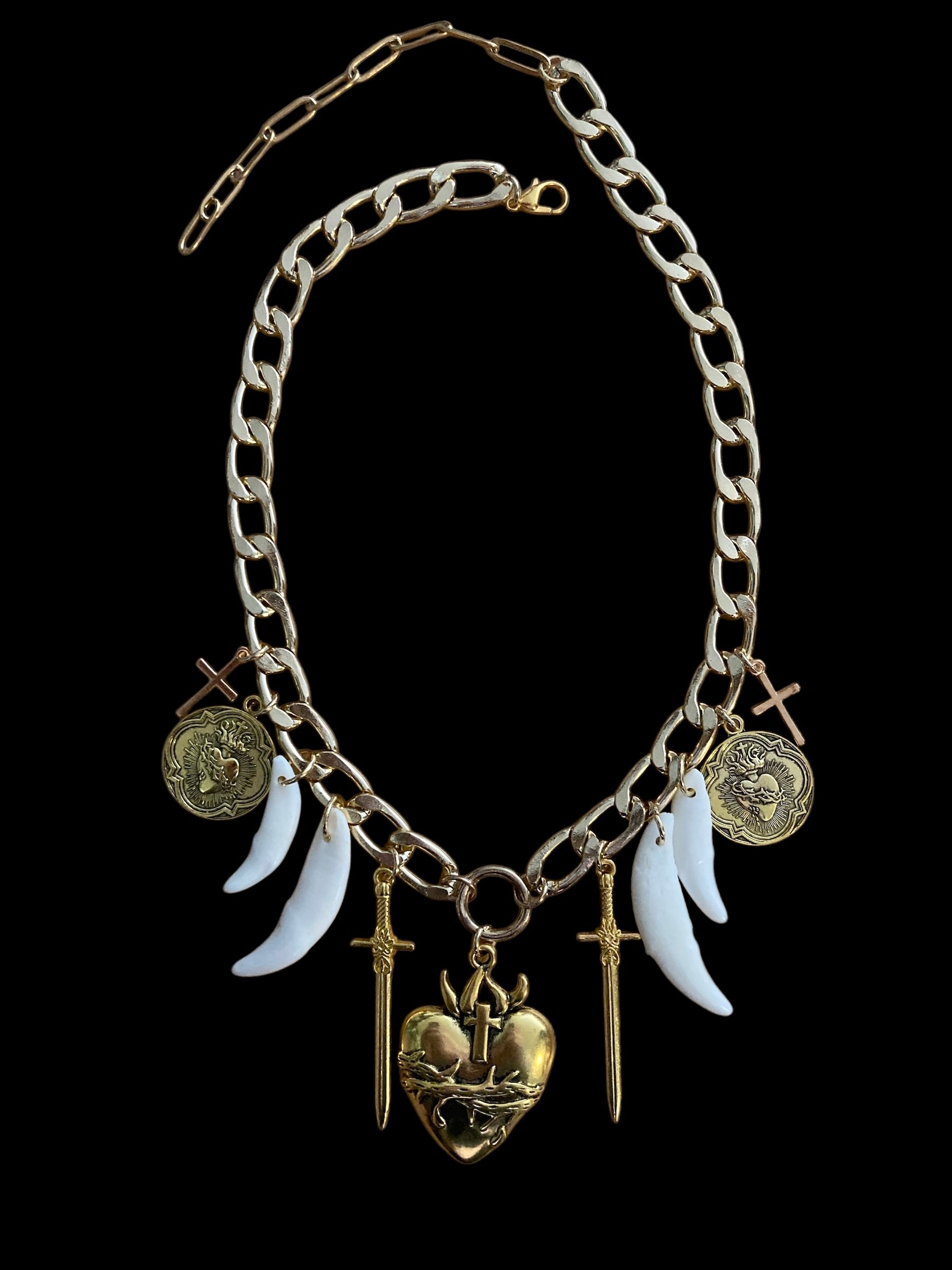 Goldtone charm necklace with Milagros, swords, and ethically sourced teeth