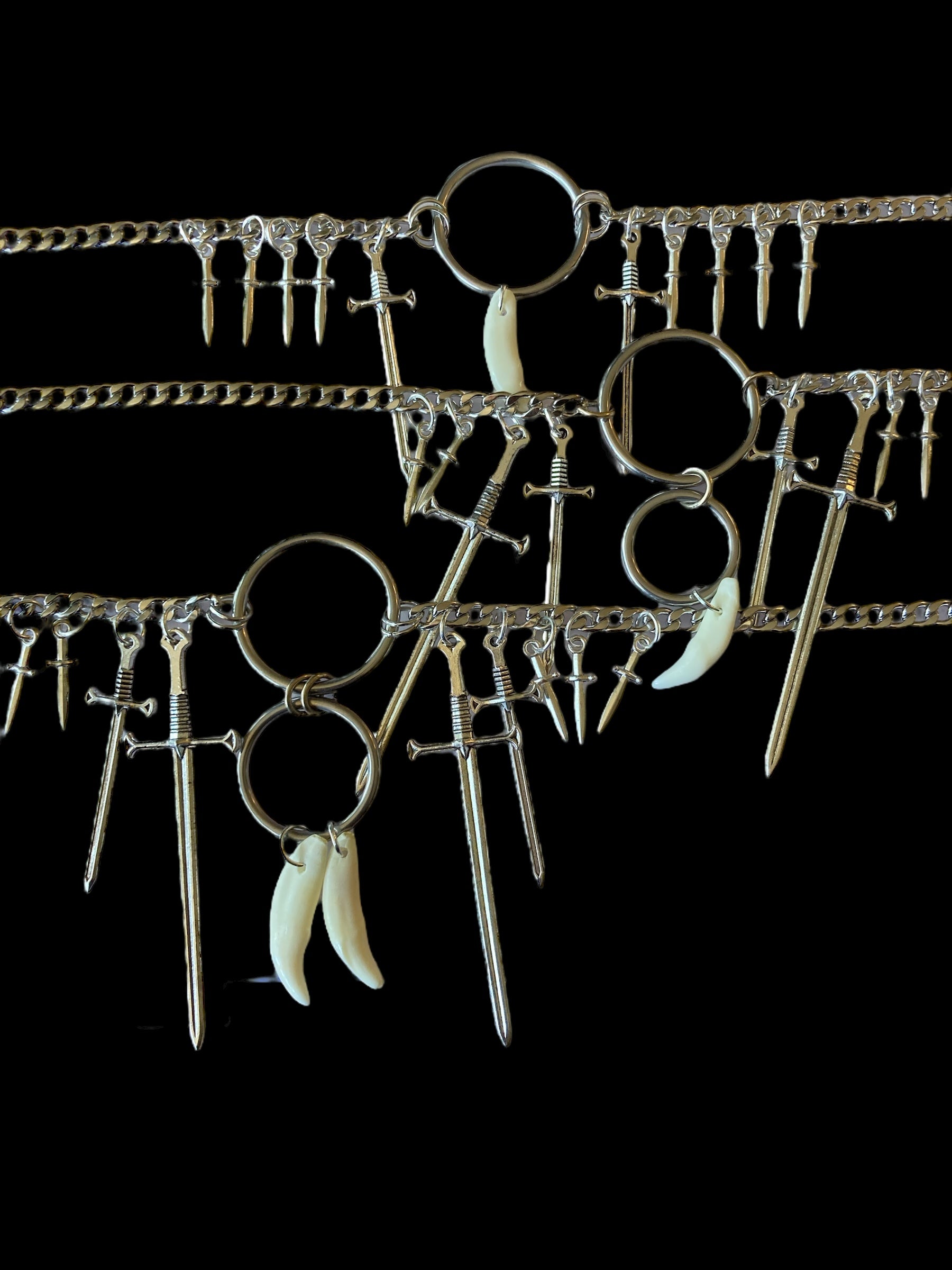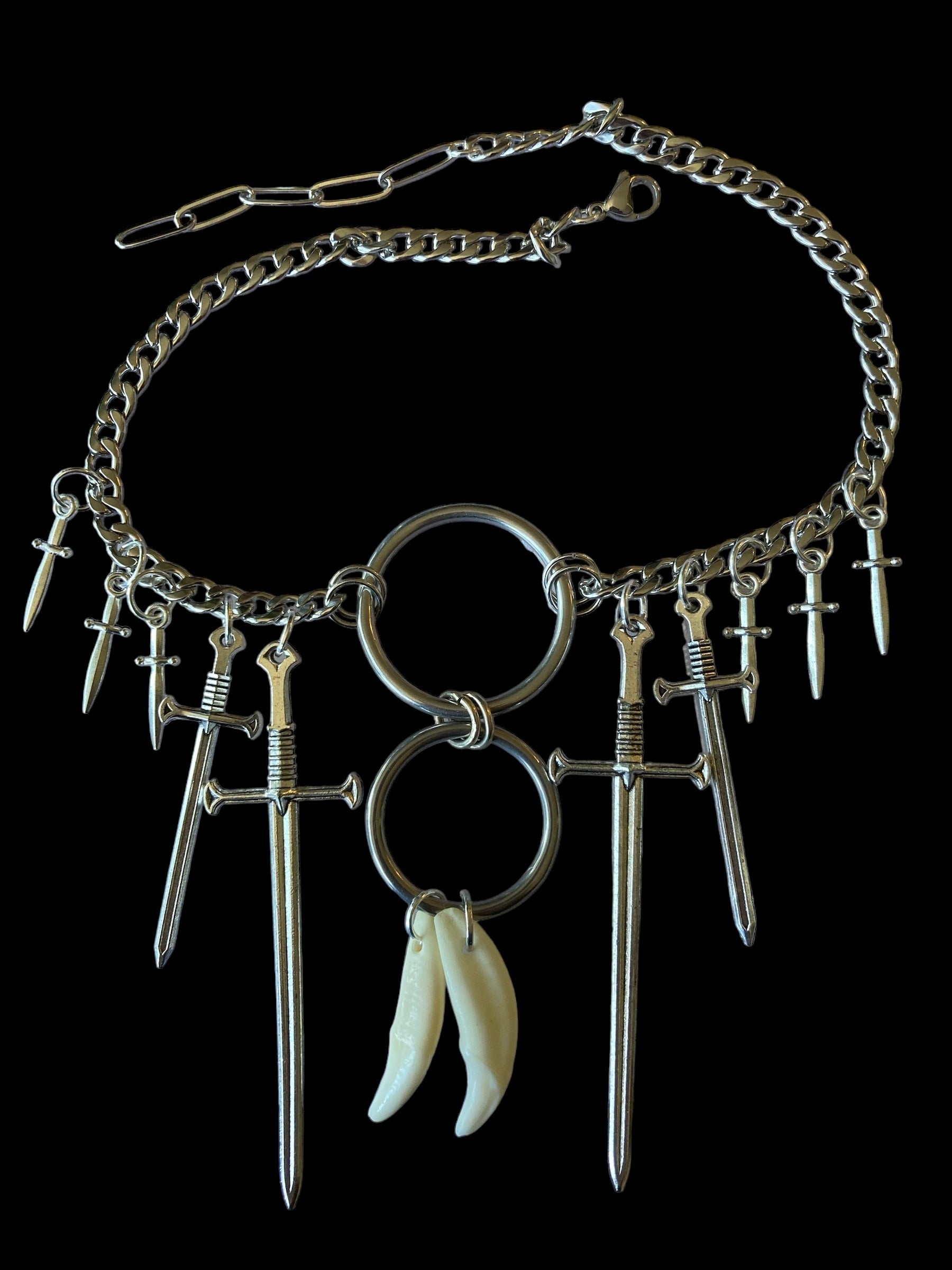 Double ring & double tooth necklace adorned with swords & mini daggers on a stainless chain
