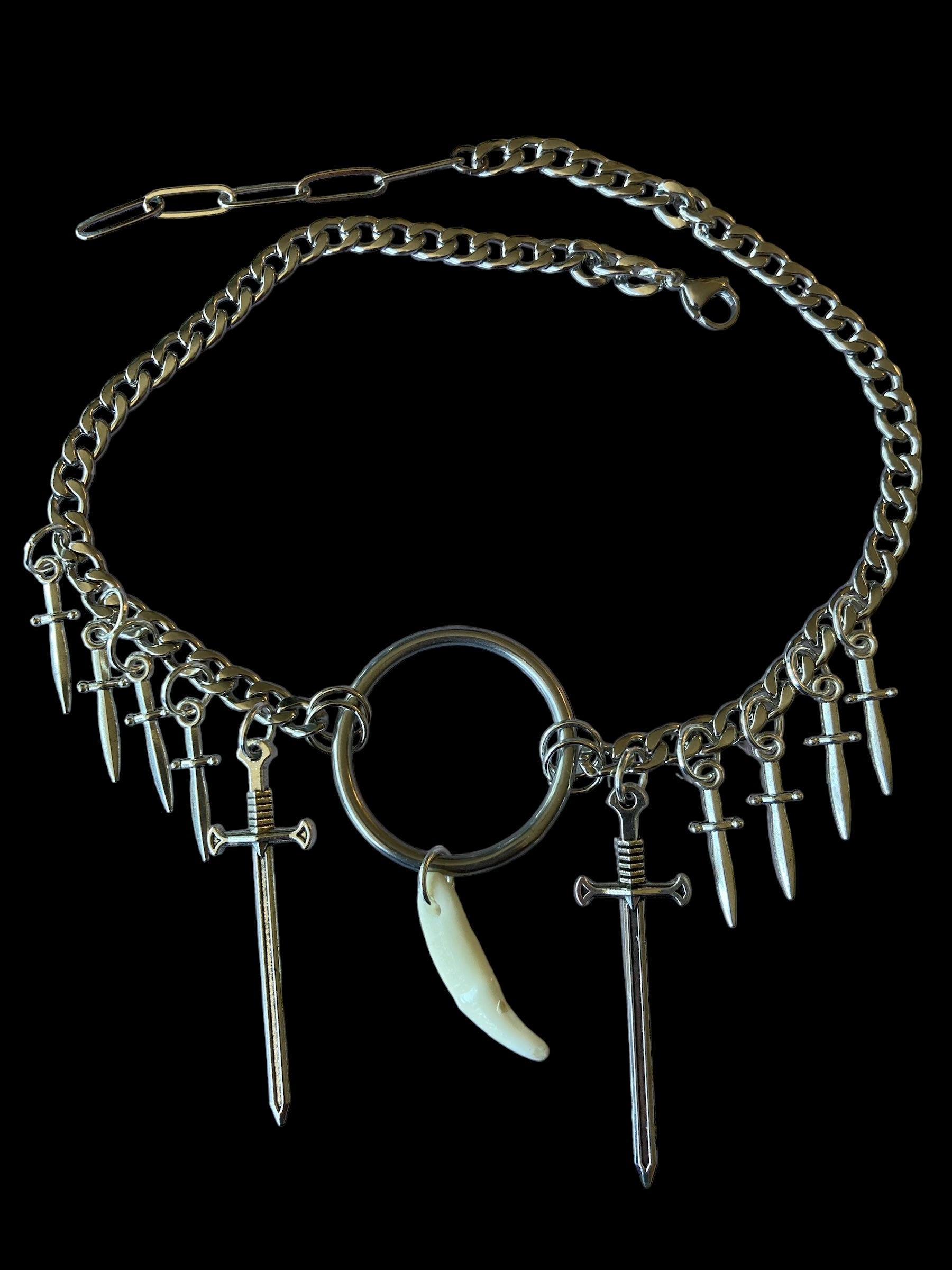 Single ring & ethically sourced trash animal tooth necklace adorned with mini daggers on a stainless chain