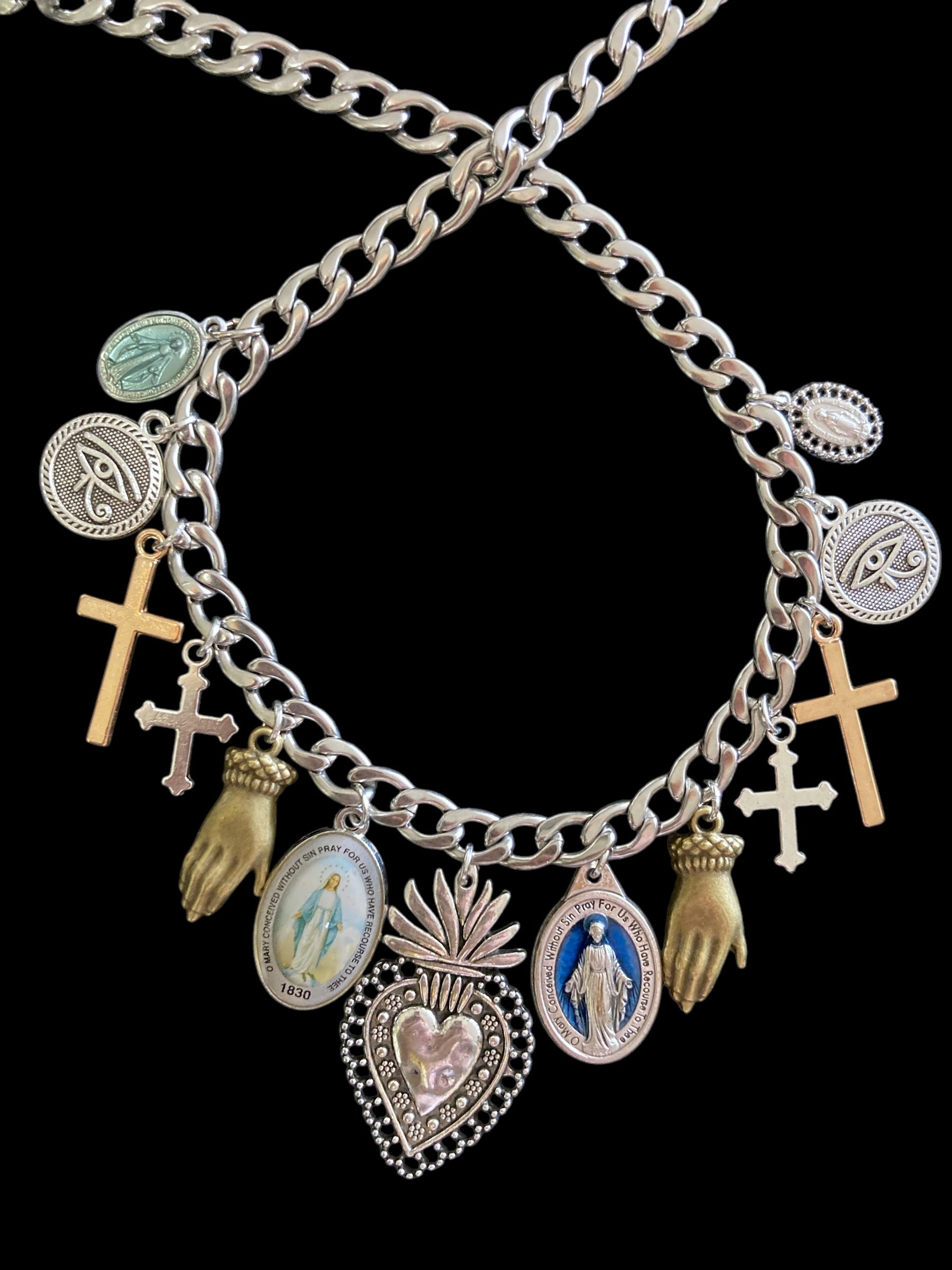 stainless chain adorned with vintage and new Milagros medals