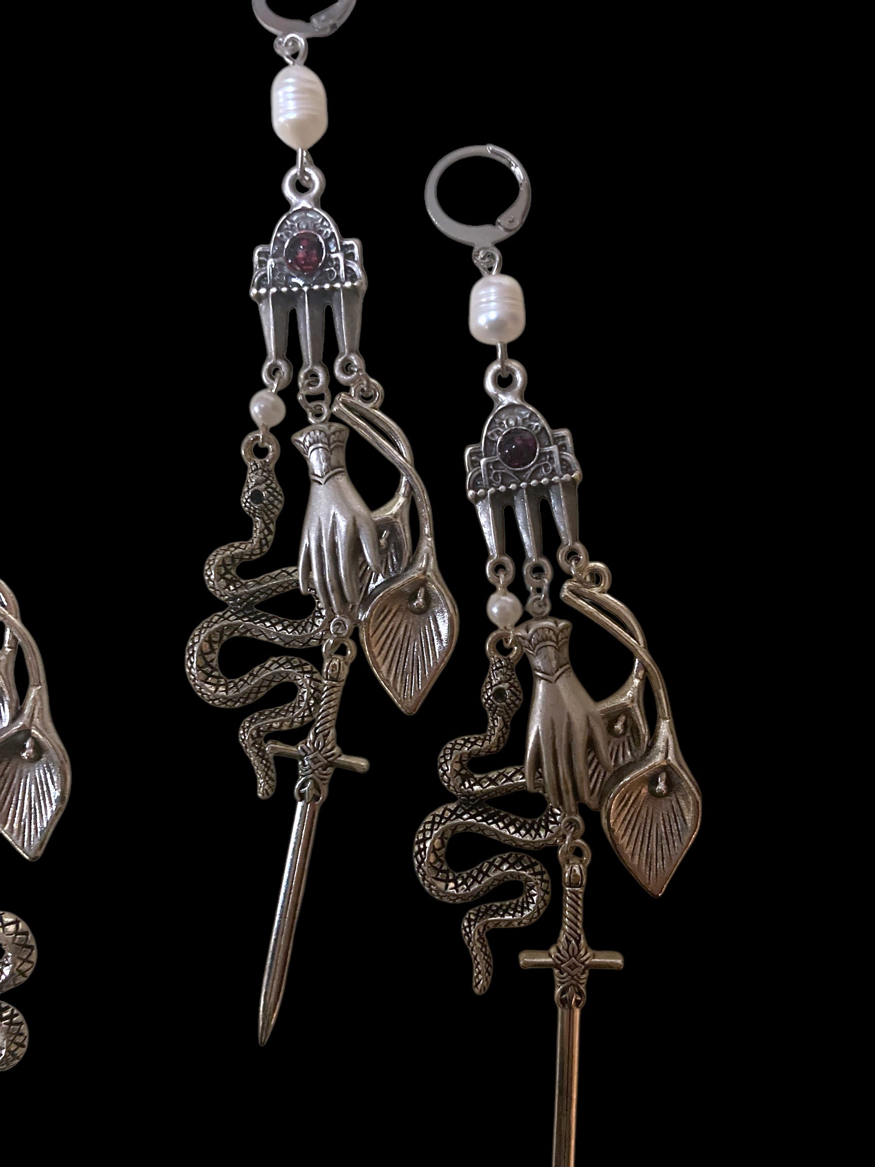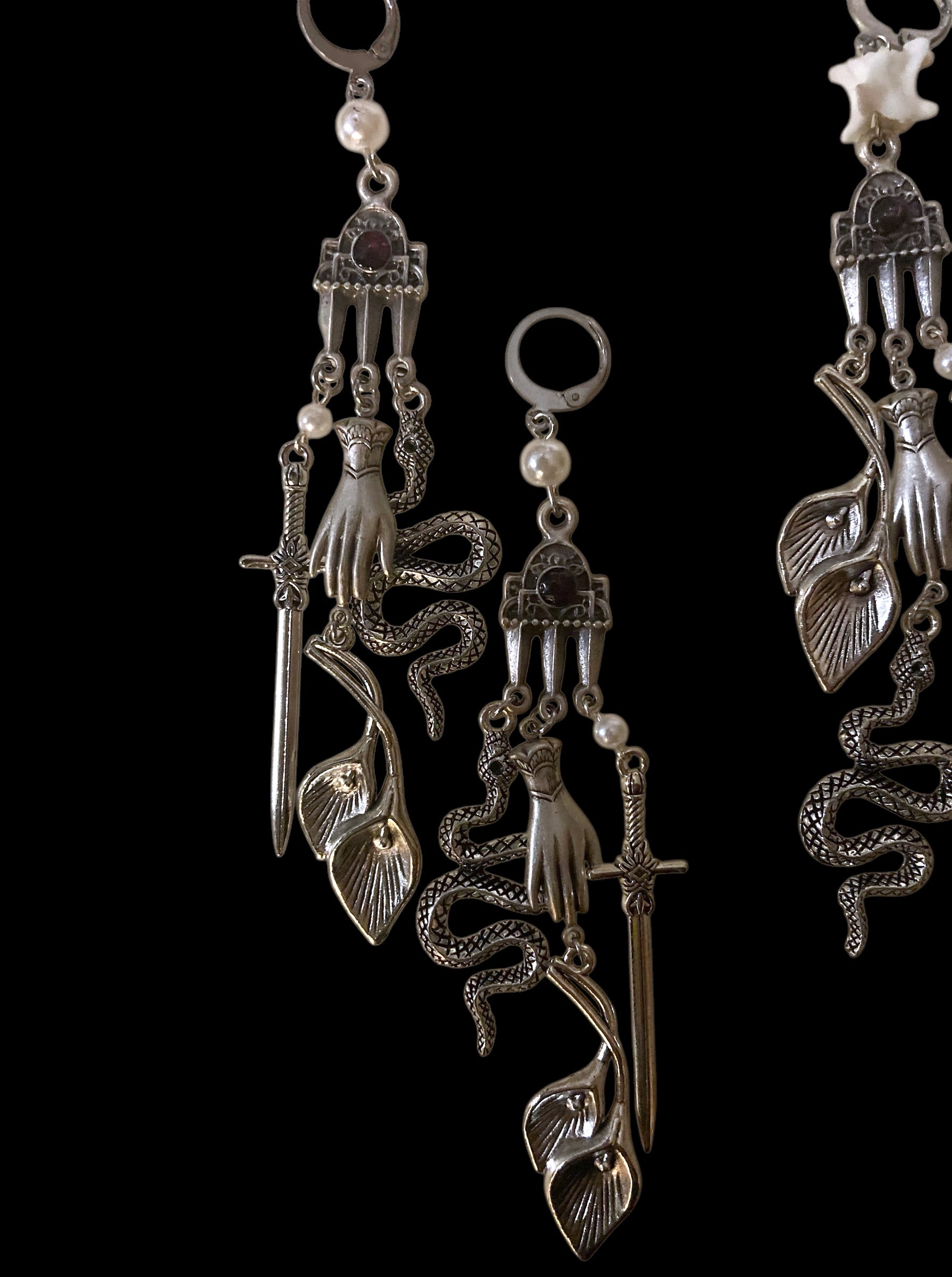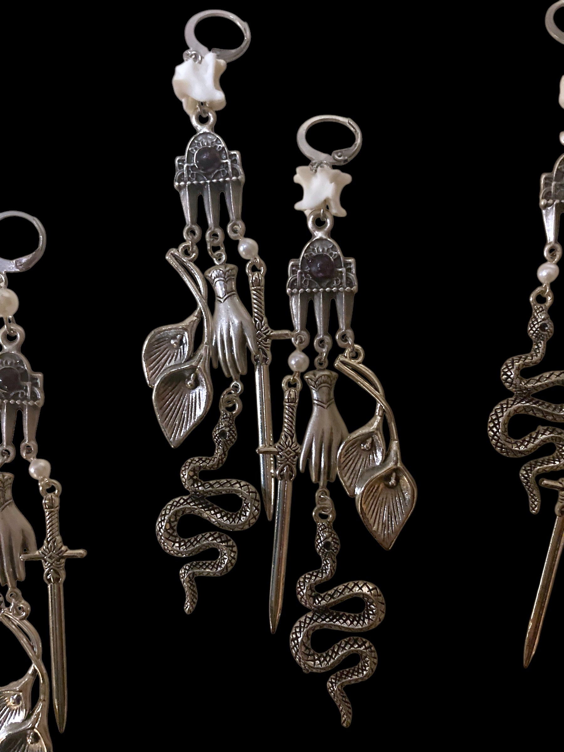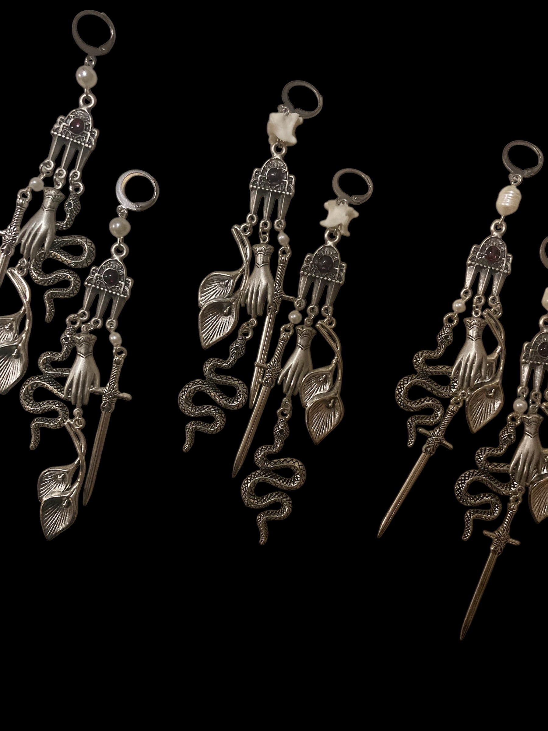 Completely one of a kind earrings made to bring you good vibes in 2025 - featuring symbols of rebirth, prosperity, truth, and protection mixed with natural elements.